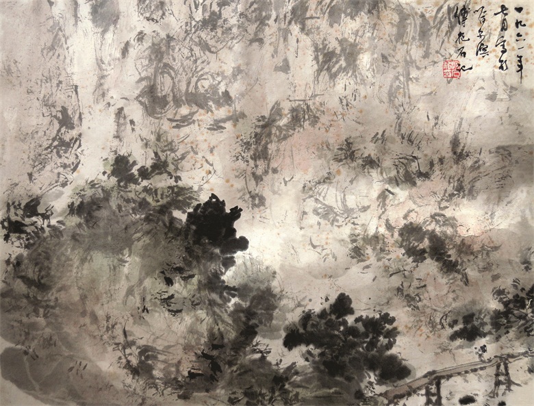 此幅作品为横式构图,虽然尺幅不太大,但是翁郁淋漓,苍山茫茫,处处气魄逼人。画中之瀑布犹如天上而降,铺天盖地,水声似扑面而来,空气也似饱含了水汽。画中山体,乱石皆标志性的抱石皴,散锋乱笔皴擦而出,笔法以气取势,磅礴多姿,自然天成。作者用笔变化多姿,浓墨处浓黑而透亮,淡墨处秀逸而朦胧,运胸中丘壑,无须题诗而诗意盎然,可谓画即是诗,诗即为画。