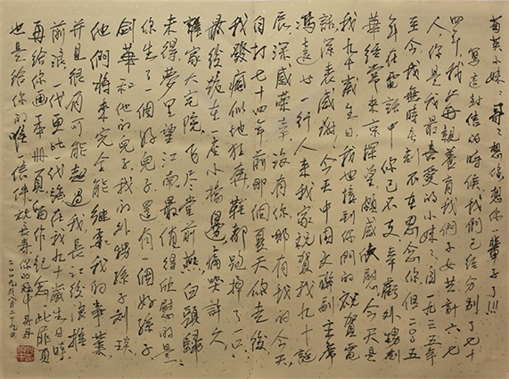 2009年12月30日吴冠中写给小妹:“五色雨,下江南,想起七十四年前,我小妹,多离缘,至今未见亲人面。为什么,天阴晴?人间多此大磨难?妹妹找哥泪花流,哥哥心里多忧愁,眼含泪,泪洗面,心里经常波浪翻!……”