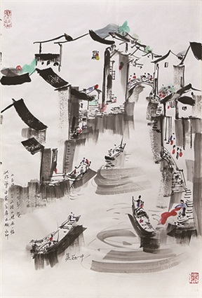 吴冠中先生格外器重《秋瑾故居》,曾写了画外话:“忠魂何处,故居似黑漆棺材,燕语生生明如剪”。 厚厚的墙,乌黑宽大的门紧闭在画面中央,近乎顶天立地,占领了宣纸之纯白,俨然画中女皇。吴冠中将《秋瑾故居》移植成的油画,北京保利2011秋拍成交价:RMB 74,750,000。