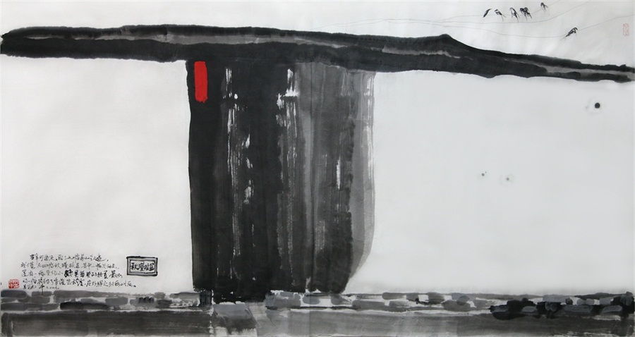 在这幅《秋瑾故居》中,吴冠中已经竭力将画面可有可无的部分进行了大量删减。画中除了爬在电线上的燕子和“秋瑾故居”门牌是具象的外,其余的物象均是模糊的、抽象的,完全以纯粹的视觉形式被呈现出来。画面上蓝天绿水的面积已被留白替代,相反墙与门的比例被夸张地放大,使得画中的形式与抽象美感更加突出。至于意境,吴冠中以往“传神写照”的手法来塑造清新恬淡的意境不同,《秋瑾故居》映射的意境是抽象的、冷漠的,非柔软的新意境。具体来说,《秋瑾故居》是用“借象写意”的手法,借以冷酷的抽象因素来阐发直指人心的悲剧意识。在众多的江南题材作品中,甚至在吴冠中的全部作品中,他认为最突出,最具代表性的是《双燕》。而从作品的创作手法和创作理念来看,《秋瑾故居》是对《双燕》的一种超越。二者虽属同一派系,但就作品中更直接的提炼手法与表达意向来说,《秋瑾故居》更趋向于吴冠中所探索的抽象美与形式美的创作理念。